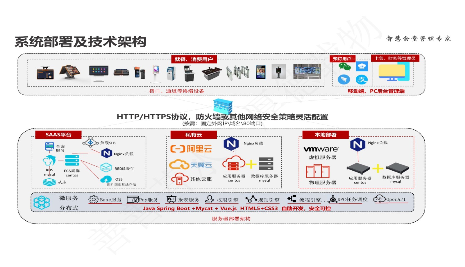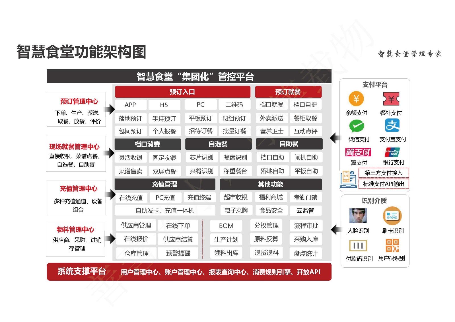 智慧食堂系統迎合移動互聯時代潮流,創新打造便捷的食堂訂餐模式,可實現精準備餐/采購、杜絕浪費/腐敗、加強員工和食堂的互動、提升員工就餐體驗和食堂服務水平。同時智慧食堂具備強大的管理功能,不僅包括采購、成本、庫存、報表、人員權限、飯卡管理等基礎食堂管理功能,還有高端的食堂總部管控能力,能滿足所有類型和規模的食堂管理需求。